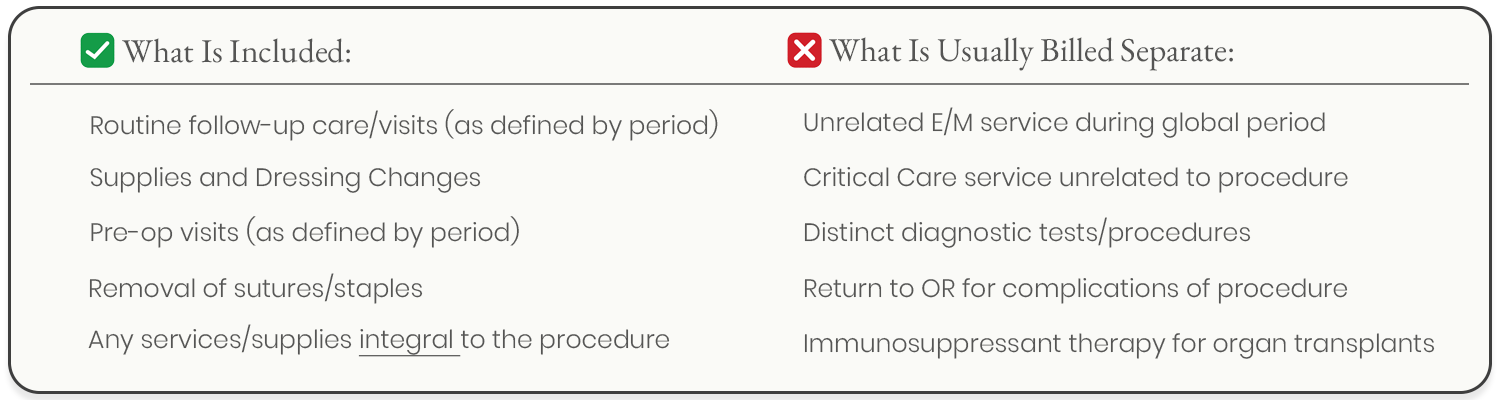 The global surgical package includes routine care tied to the surgery. Medicare bundles this so it’s generally not billable separately