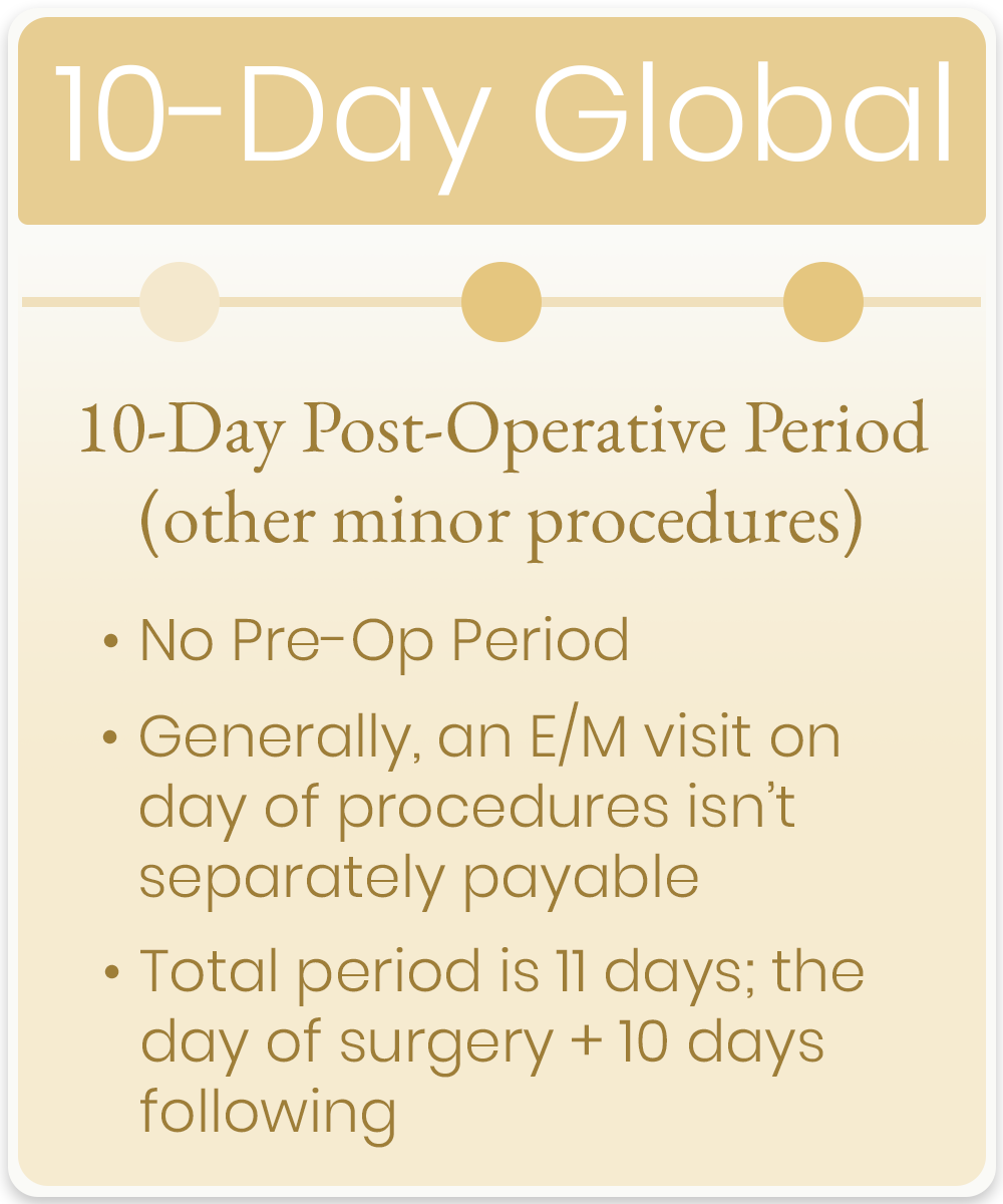 The 10-Day period covers the procedure plus routine post-operative care for 10 days. This actually makes the global period 11 days total.