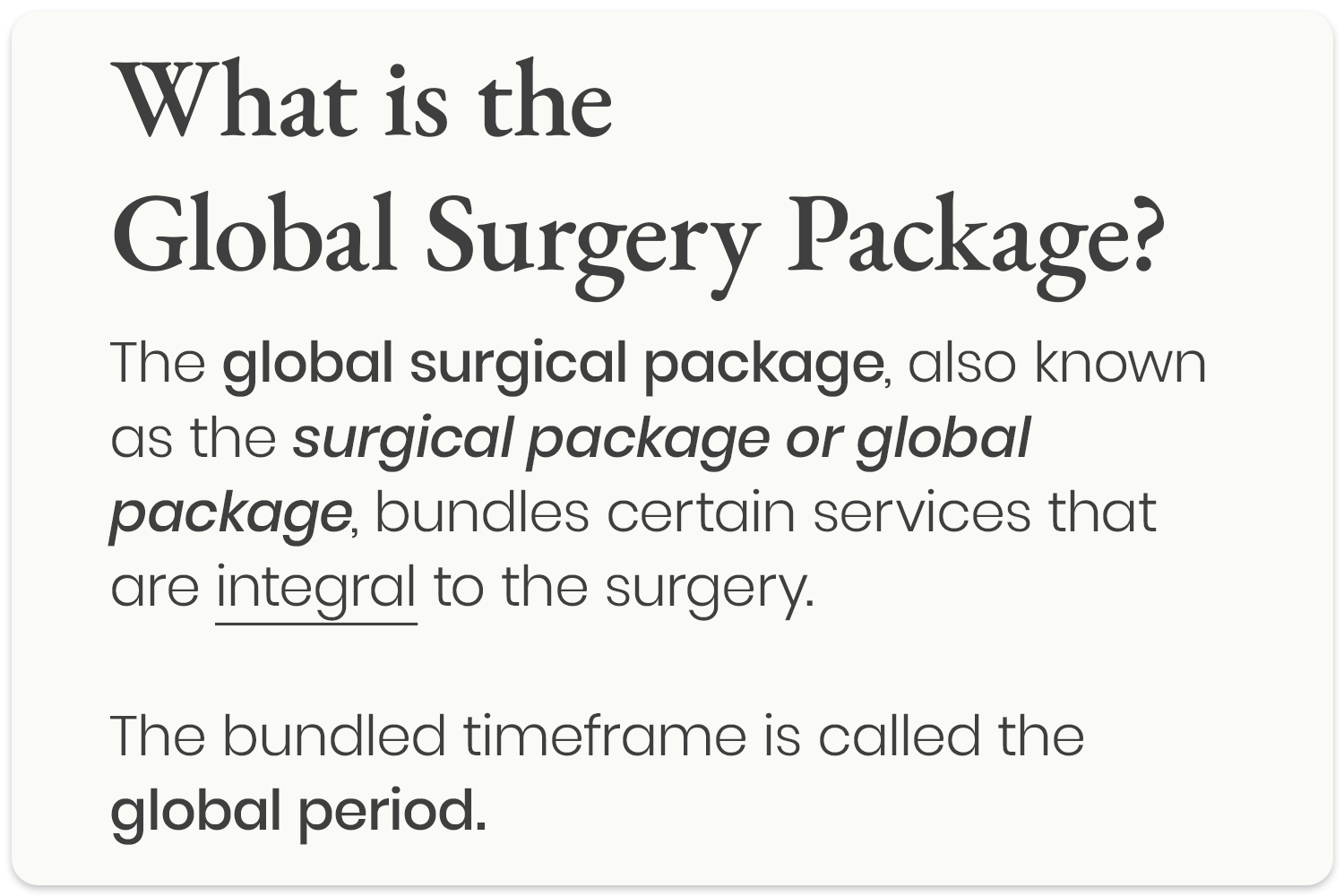 The global period is a standardized timeframe (0, 10, or 90 days) following a surgical procedure that bundles pre-operative, intra-operative, and post-operative care into a single fee paid to the surgeon.