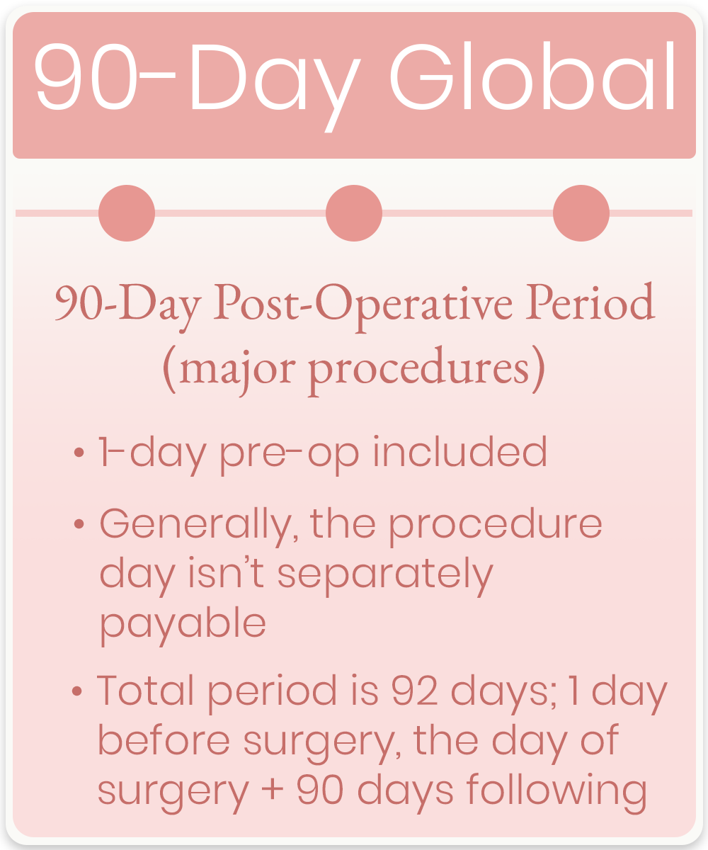 The 90-Day period covers one day of pre-operative care, the procedure, plus routine post-operative care for 90 days. This actually makes the global period 92 days total.
